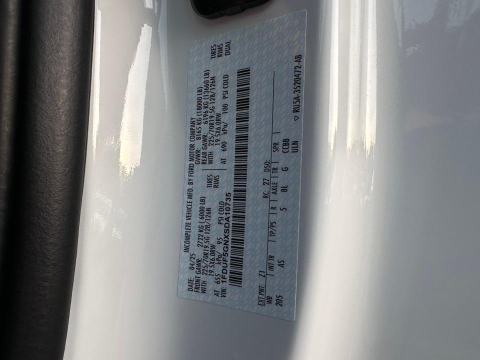 2025 Ford F-550SD XLGVWR: 18,000 lbs Payload Package, Order Code 660A, Snow Plow Prep Package, XL Chrome Package (Bright Grille, Chrome Front Bumper, Halogen Fog Lamps, and Remote Start), 120V/400W Outlet, 190 Amp Alternator, 4 Speakers, 4-Wheel Disc Brakes, 410 Amp Dual Alternators, 6-Ton Hydraulic Jack, ABS brakes, Air Conditioning, AM/FM radio, AM/FM Stereo w/MP3 Player, Brake assist, Compass, Delay-off headlights, Dual 68 AH/65 AGM Battery, Dual front impact airbags, Dual front side impact airbags, Dual rear wheels, Emergency communication system: SYNC 4 911 Assist, Front anti-roll bar, Front Center Armrest w/Storage, Front License Plate Bracket, Front reading lights, Fully automatic headlights, HD Vinyl 40/20/40 Split Bench Seat, Heated door mirrors, Illuminated entry, Outside temperature display, Overhead airbag, Overhead console, Panic alarm, Passenger cancellable airbag, Passenger vanity mirror, Platform Running Boards, Power door mirrors, Power steering, Power windows, Rear anti-roll bar, Remote keyless entry, Security system, Speed control, Steering wheel mounted audio controls, SYNC 4 Communication & Entertainment System, Tachometer, Telescoping steering wheel, Tilt steering wheel, Traction control, Trip computer, Turn signal indicator mirrors, Variably intermittent wipers, and Wheels: 19.5" x 6" Argent Painted Steel.