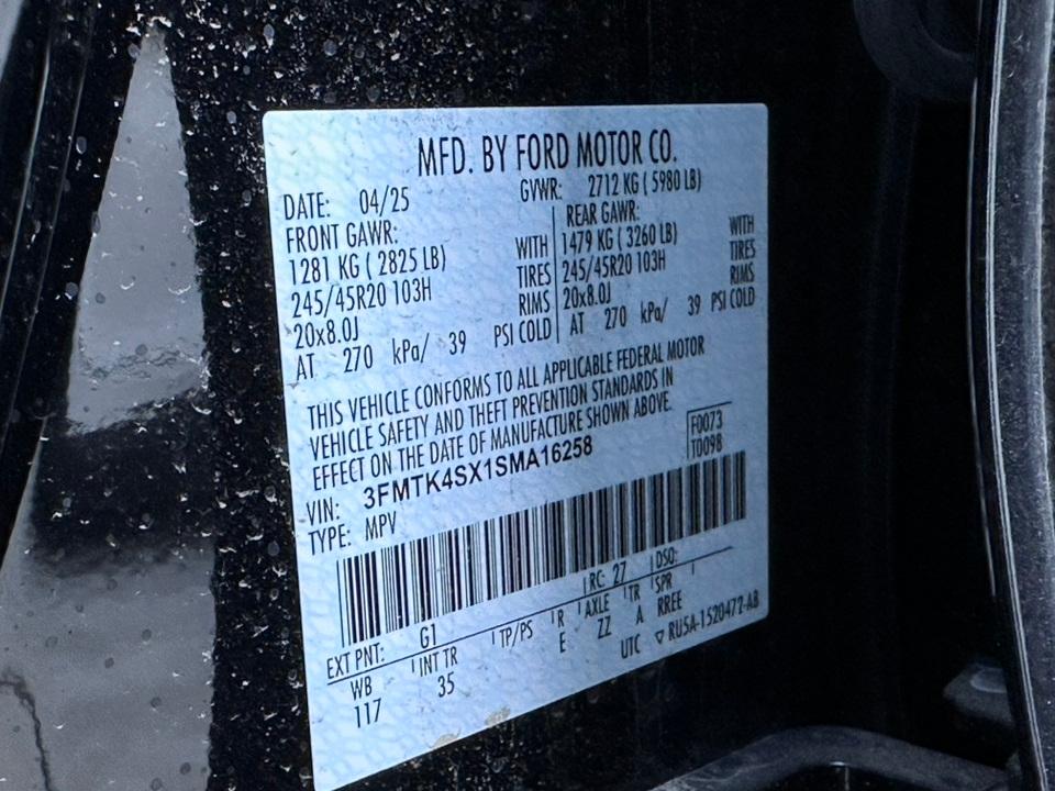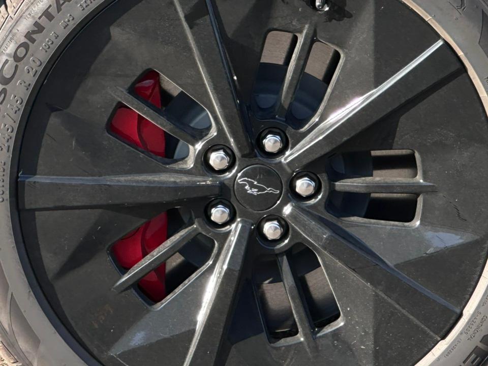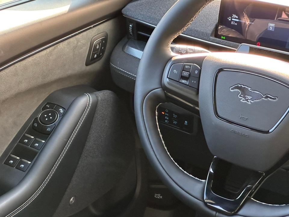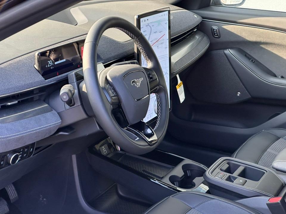 2025 Ford Mustang Mach-E GTEquipment Group 400A Standard Package, Interior Protection Package (1st & 2nd Row Floor Liners w/o Carpet Mats, Cargo Area Cover, and Cargo Floor Liner), 10 Speakers, 4-Wheel Disc Brakes, ABS brakes, Adaptive suspension, Air Conditioning, Alloy wheels, AM/FM radio: SiriusXM with 360L, Apple CarPlay/Android Auto, Auto High-beam Headlights, Auto-dimming Rear-View mirror, Automatic temperature control, Brake assist, Bumpers: body-color, Compass, Delay-off headlights, Driver door bin, Driver vanity mirror, Dual front impact airbags, Dual front side impact airbags, Electronic Stability Control, Emergency communication system: 911 Assist, Exterior Parking Camera Rear, Four wheel independent suspension, Front anti-roll bar, Front Bucket Seats, Front Center Armrest, Front dual zone A/C, Front License Plate Bracket, Front reading lights, Fully automatic headlights, Garage door transmitter, Heated door mirrors, Heated front seats, Heated Perforated ActiveX Performance Seats, Heated steering wheel, Hood & Decklid Stripe/Door Graphics Delete, Illuminated entry, Knee airbag, Low tire pressure warning, Memory seat, Mobile Power Cord (120V/240V), Mustang Mach-E GT Performance Upgrade, Navigation system: Connected Navigation, Occupant sensing airbag, Outside temperature display, Overhead airbag, Overhead console, Panic alarm, Panoramic Fixed-Glass Roof, Passenger door bin, Passenger vanity mirror, Power door mirrors, Power driver seat, Power Liftgate, Power passenger seat, Power steering, Power windows, Radio data system, Radio: B&O Sound System by Bang & Olufsen, Rain sensing wipers, Rear anti-roll bar, Rear seat center armrest, Rear side impact airbag, Rear window defroster, Rear window wiper, Remote keyless entry, Security system, SiriusXM w/360L, Speed control, Speed-sensing steering, Speed-Sensitive Wipers, Split folding rear seat, Spoiler, Steering wheel mounted audio controls, SYNC 4A w/Enhanced Voice Recognition, Telescoping steering wheel, Tilt steering wheel, Traction control, Trip computer, Turn signal indicator mirrors, Variably intermittent wipers, and Wheels: 20" Monochromatic High Gloss Black-Painted.
