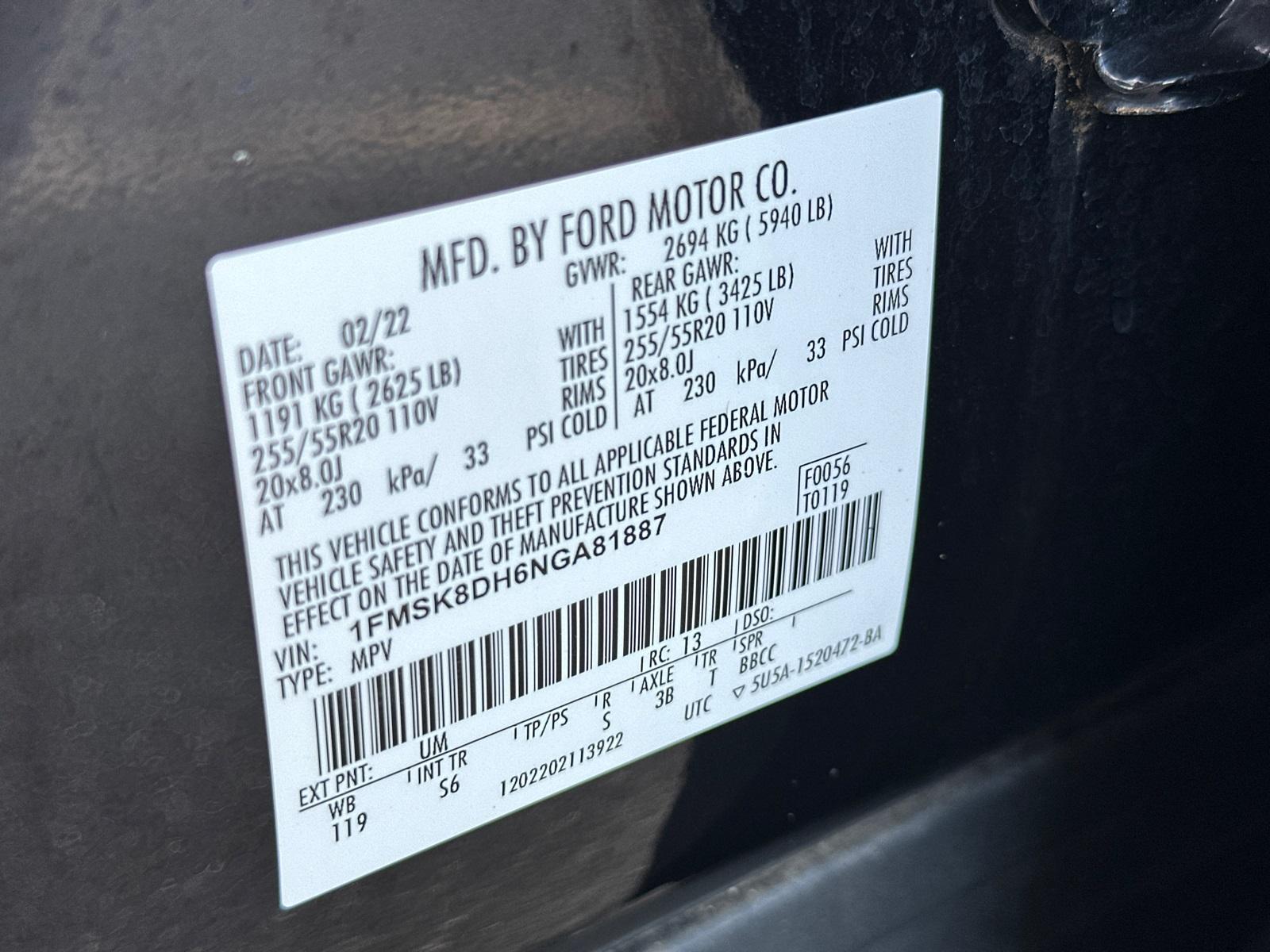 VIN #: 1FMSK8DH6NGA81887