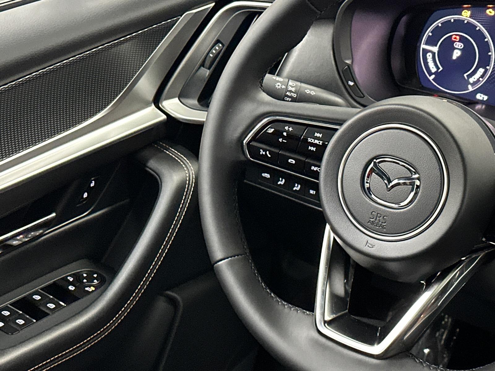 2025 Mazda CX-90 PHEV Premium Plus12 Speakers, 3rd row seats: bench, 4-Wheel Disc Brakes, ABS brakes, Air Conditioning, Alloy wheels, AM/FM radio: SiriusXM, Artisan Red Premium Paint Charge, Auto High-beam Headlights, Auto-dimming door mirrors, Auto-dimming Rear-View mirror, Automatic temperature control, Brake assist, Bumpers: body-color, Compass, Delay-off headlights, Driver door bin, Driver vanity mirror, Dual front impact airbags, Dual front side impact airbags, E911 Automatic Emergency Notification, Electronic Stability Control, Emergency communication system: MAZDA CONNECT, Four wheel independent suspension, Front anti-roll bar, Front Bucket Seats, Front Center Armrest w/Storage, Front dual zone A/C, Front reading lights, Fully automatic headlights, Garage door transmitter: HomeLink, Heads-Up Display, Heated door mirrors, Heated front seats, Heated rear seats, Heated steering wheel, Heated/Ventilated Front Bucket Seats, Illuminated entry, Infotainment System Voice Command, Knee airbag, Leather Shift Knob, Leather steering wheel, Low tire pressure warning, Mazda Connected Services, Mazda Navigation System, Memory seat, Nappa Leather Seat Trim, Navigation system: MAZDA CONNECT, Occupant sensing airbag, Outside temperature display, Overhead airbag, Overhead console, Pandora Internet Radio Integration, Panic alarm, Passenger door bin, Passenger vanity mirror, Power door mirrors, Power driver seat, Power Liftgate, Power Moonroof, Power passenger seat, Power steering, Power windows, Radio Broadcast Data System Program Information, Radio data system, Radio: AM/FM w/HD/Bose 12-Speaker Sound System, Rain sensing wipers, Rear air conditioning, Rear anti-roll bar, Rear reading lights, Rear window defroster, Rear window wiper, Remote keyless entry, Security system, SMS Text Msg Audio Delivery & Reply, Speed control, Speed-sensing steering, Split folding rear seat, Spoiler, Steering wheel mounted audio controls, Tachometer, Telescoping steering wheel, Tilt steering wheel, Traction control, Trip computer, Turn signal indicator mirrors, Variably intermittent wipers, Ventilated front seats, and Wheels: 21" x 9.5J Aluminum Alloy.