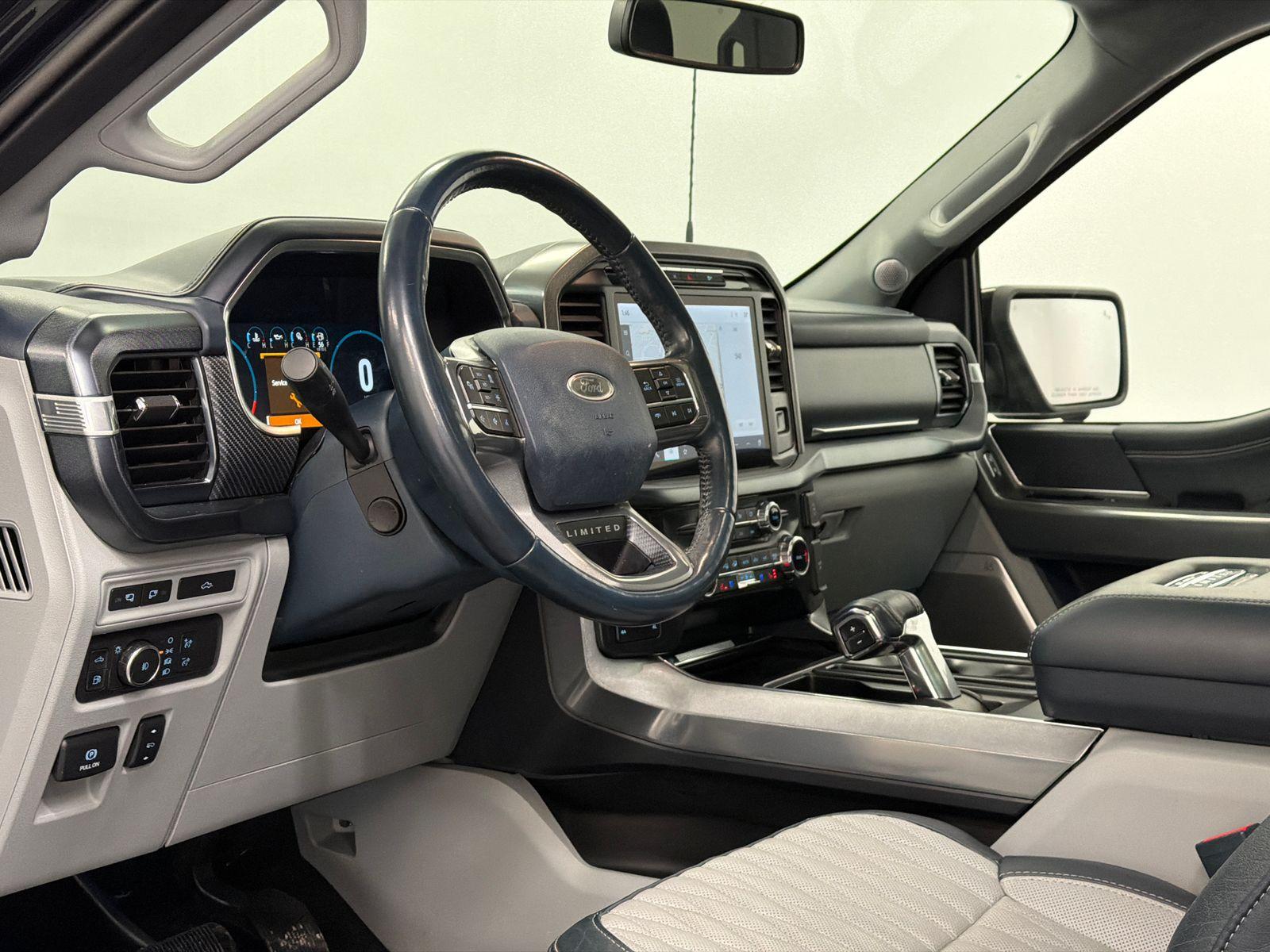 CERTIFIED PRE OWNED. 3.5L POWERBOOST LIMITED. FULLY LOADED LIMITED MODEL. F-150 Limited, 4D SuperCrew, 3.5L PowerBoost Full-Hybrid V6, 10-Speed Automatic, 4WD, Agate Black Metallic, Admiral Blue w/Unique Leather Bucket Seats, Equipment Group 900A Standard, Navigation system: Connected Navigation.This vehicle has been equipped with our OPTIONAL dealer-installed Total Confidence Plus Package ($2,995), which includes: Loaner for Life, Digital Fraud Protection, Anti-Theft Vin Marking, Collision Loyalty Credit, Stolen Vehicle Assistance, Paint and Fabric Protection, 1st Oil Change, A/C Refresh Service, Rain Repellent, 7-Day Exchange (used only),Headlight Protection, 2nd Key & Remote, Full Tank of Gas, Nitrogen Tire Service, Door Edge & Cup Guards, Roadside Assistance Plan, $500 Coupon, Additional 1 Month/1,000 Mile Warranty (non-CPO used vehicles), and a Customer Welcome Kit with Customer Mobile App . This package is optional, not required by law, and not included in the advertised price. It may be purchased separately at the time of sale.